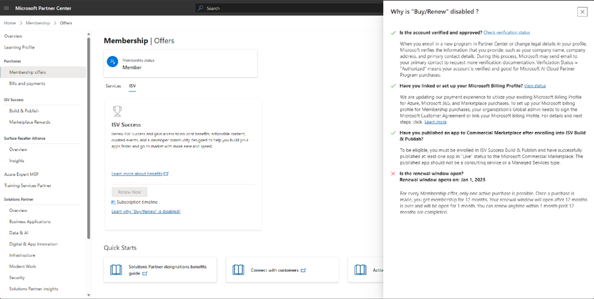 갱신 옵션은 현재 혜택 패키지의 종료 날짜 30일 전에 사용할 수 있게 됩니다. 자격은 계정 확인, 청구 프로필 생성, 게시 상태 및 혜택 종료 날짜의 30일 이내를 기준으로 합니다. 멤버십 혜택 페이지의 파트너 센터에서 자격을 확인할 수 있습니다.
