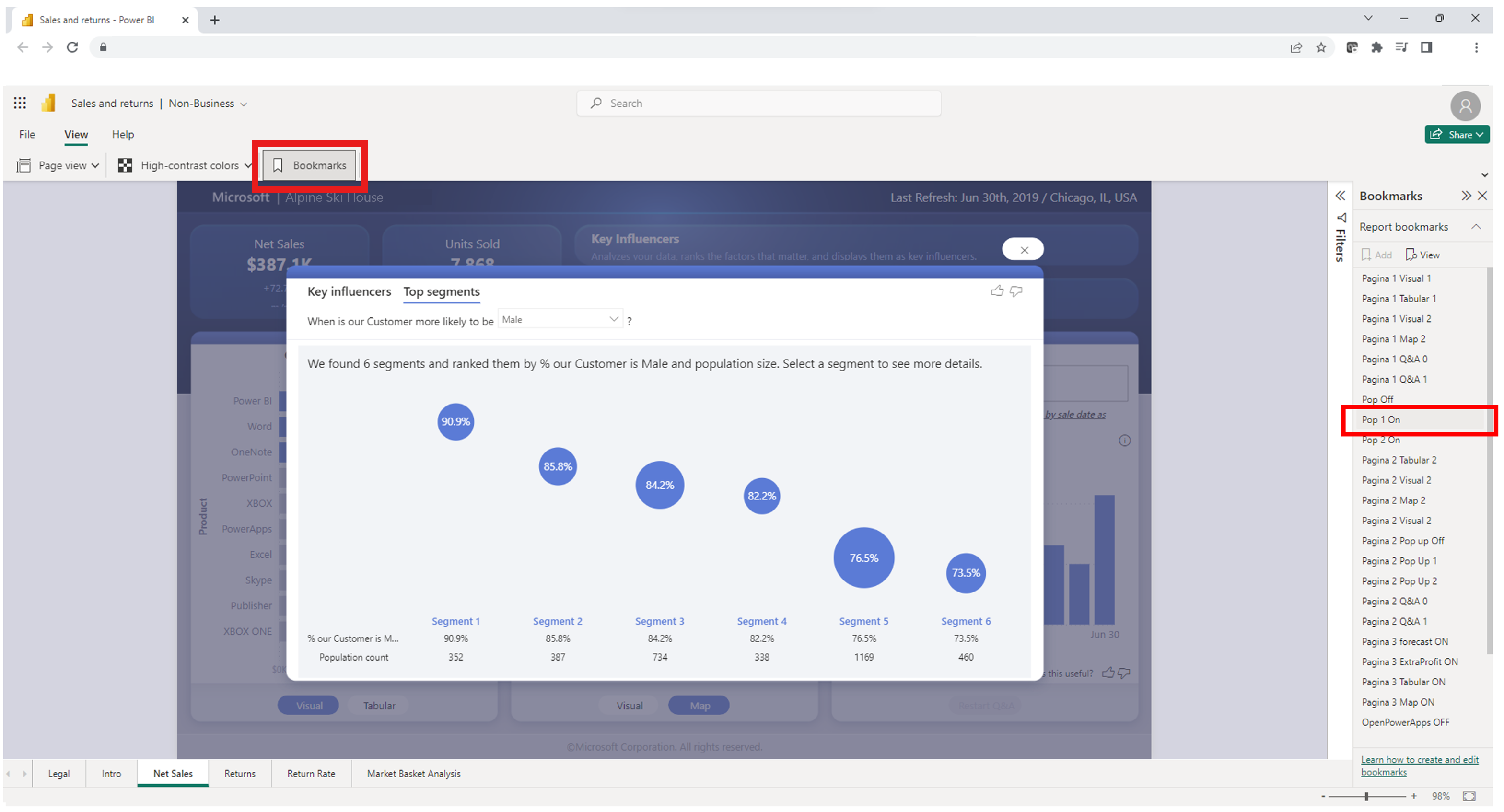 저장된 책갈피를 보려면 보고서의 왼쪽 위 모서리에서 책갈피 단추를 선택합니다. 이 단추를 선택하면 브라우저 오른쪽에 책갈피 창이 나타납니다. 보고서 작성자가 만든 책갈피를 선택할 수 있습니다. 책갈피 중 하나를 선택하면 해당 책갈피에 할당된 보고서의 필터링된 버전이 표시됩니다.