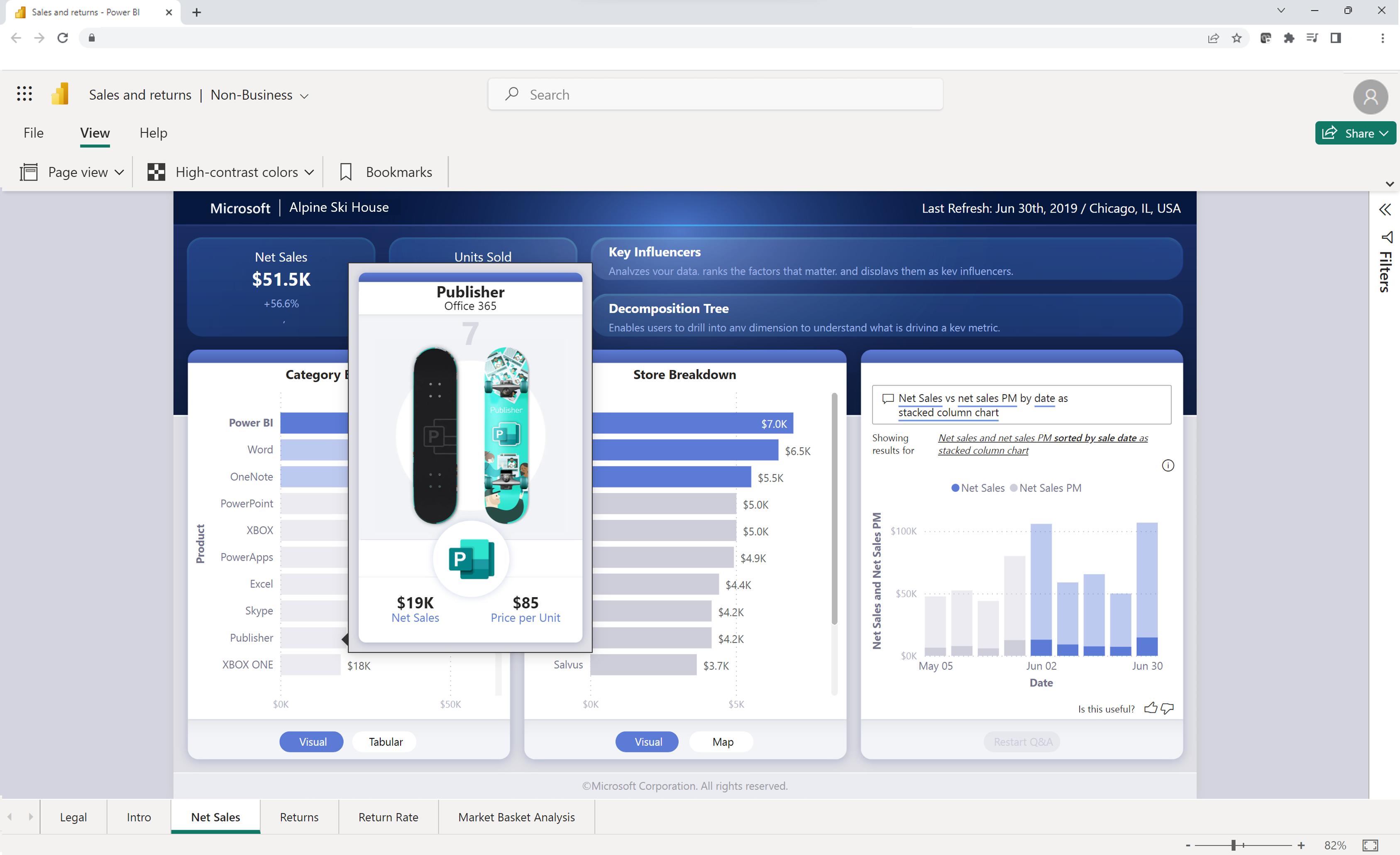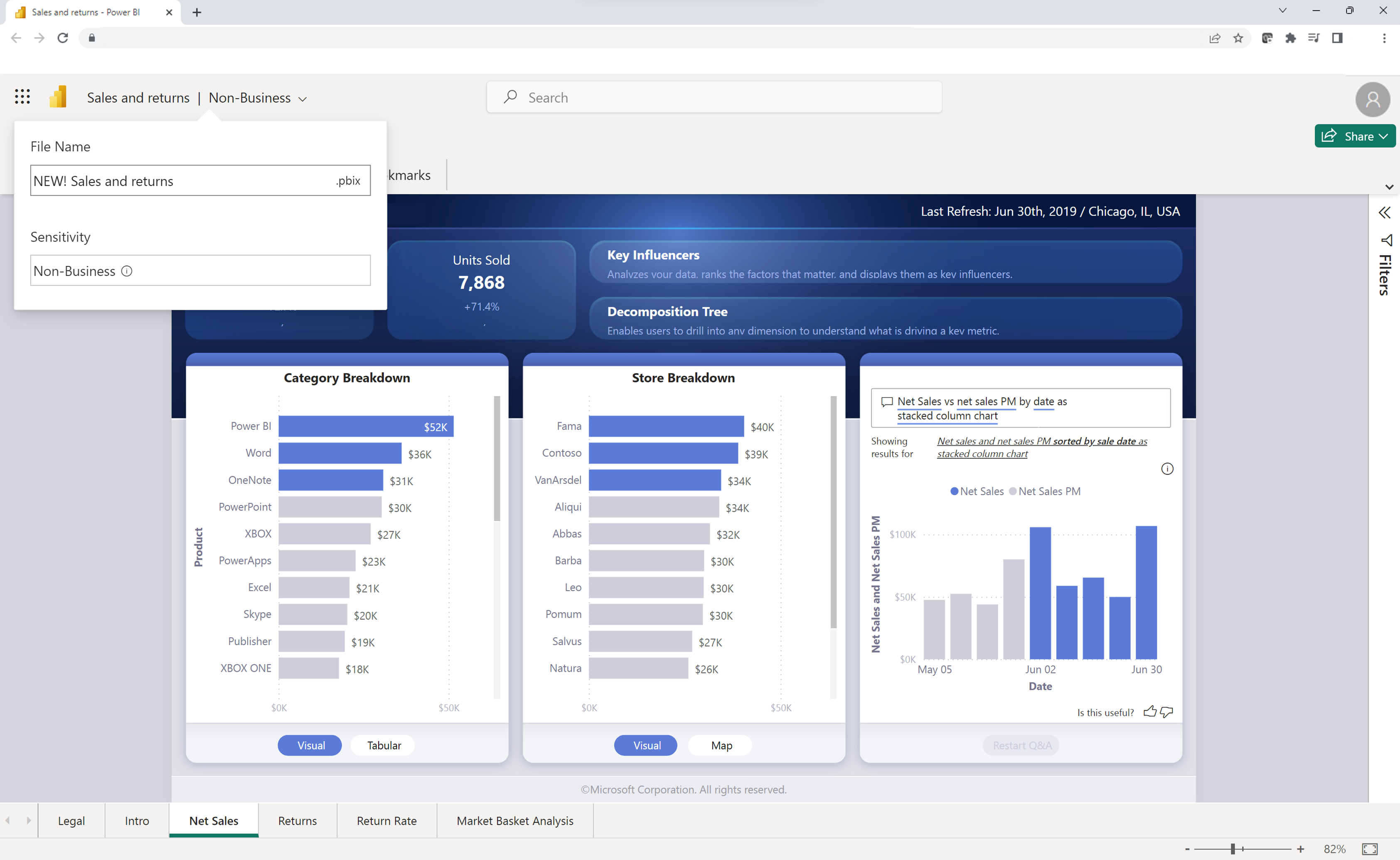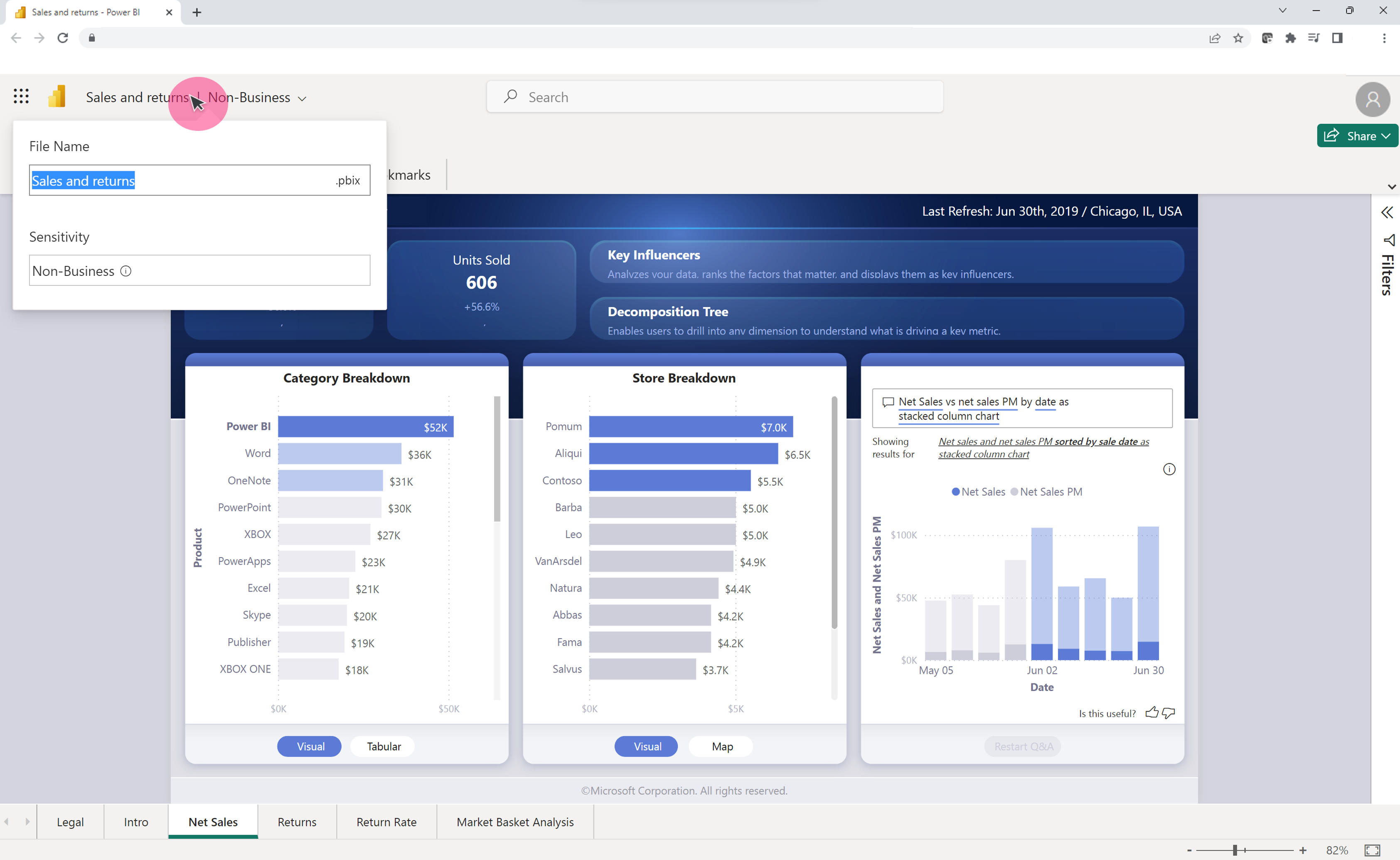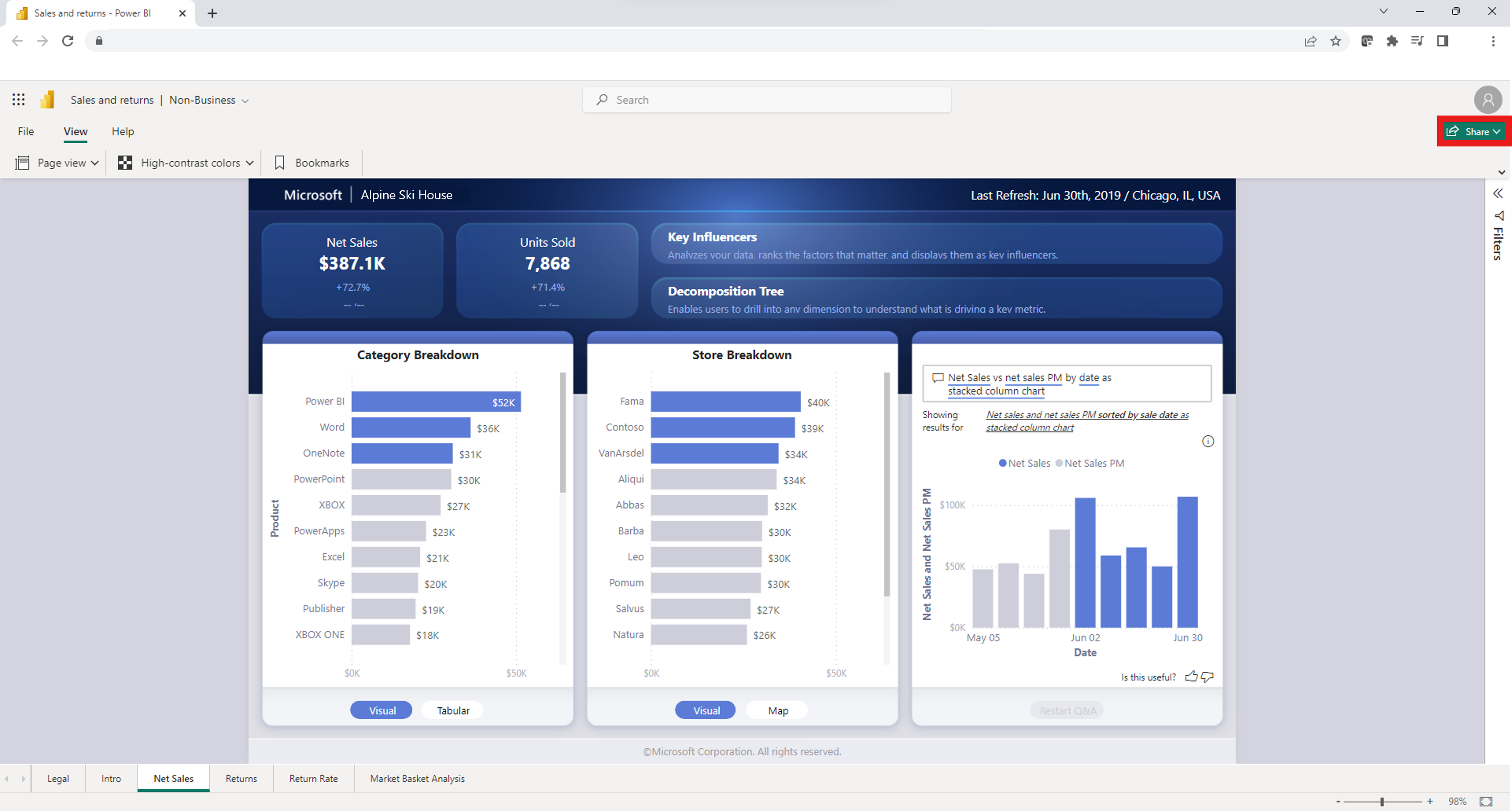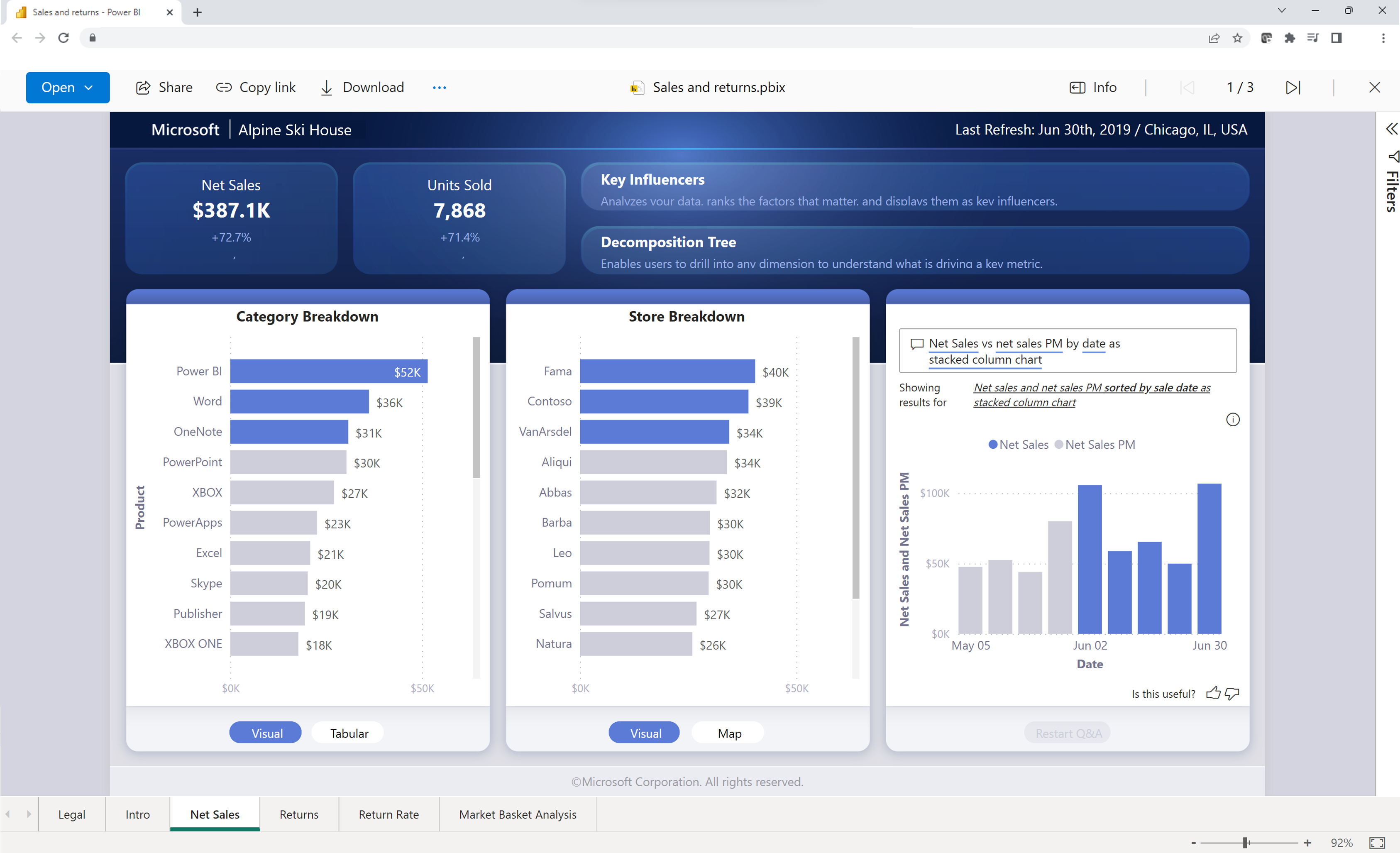 보고서가 열리면 시각적 개체와 상호 작용하고 기본 데이터를 탐색하여 중요한 정보를 발견할 수 있습니다.