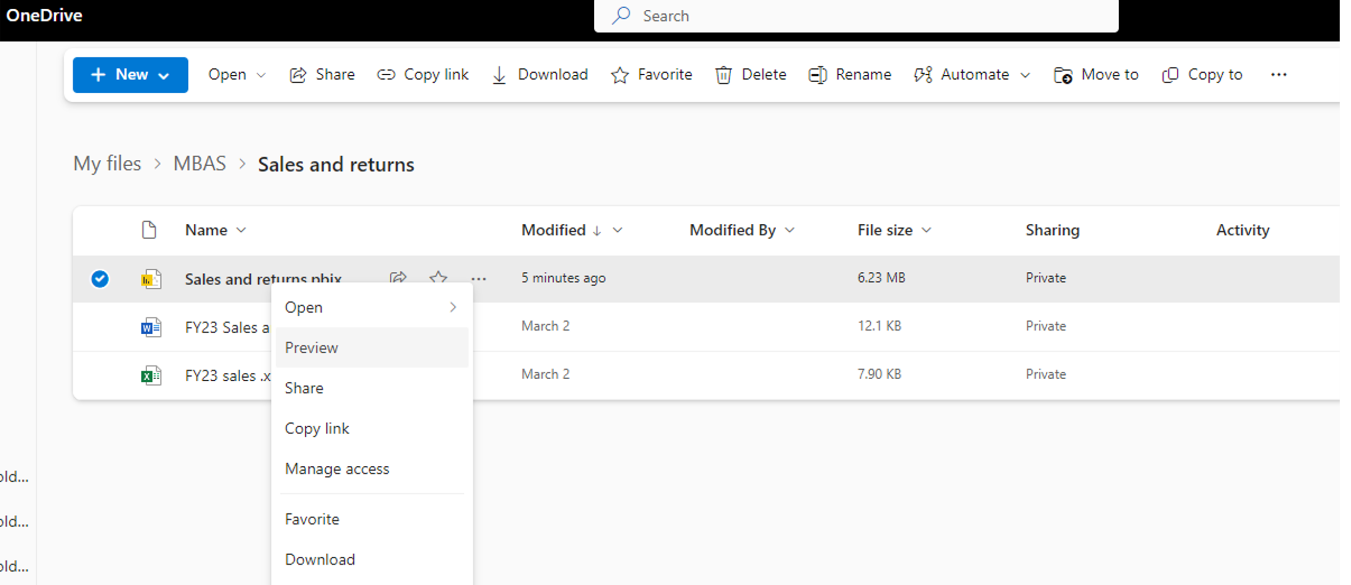 파일을 마우스 오른쪽 단추로 클릭하거나 기타 옵션(...)>미리 보기를 선택하여 미리 보기 모드로 파일을 열 수도 있습니다.