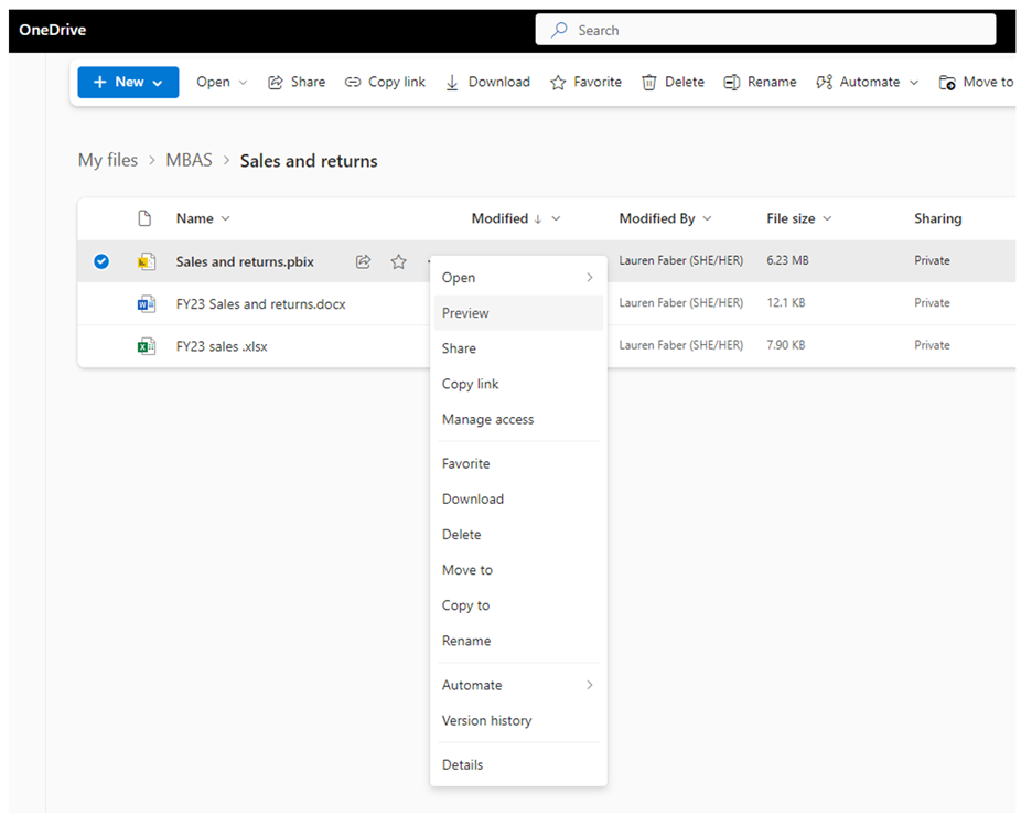 브라우저에서 OneDrive 및 SharePoint에 저장된 Power BI 보고서를 직접 보는 것은 간단합니다. 파일을 직접 선택하여 브라우저에서 엽니다.