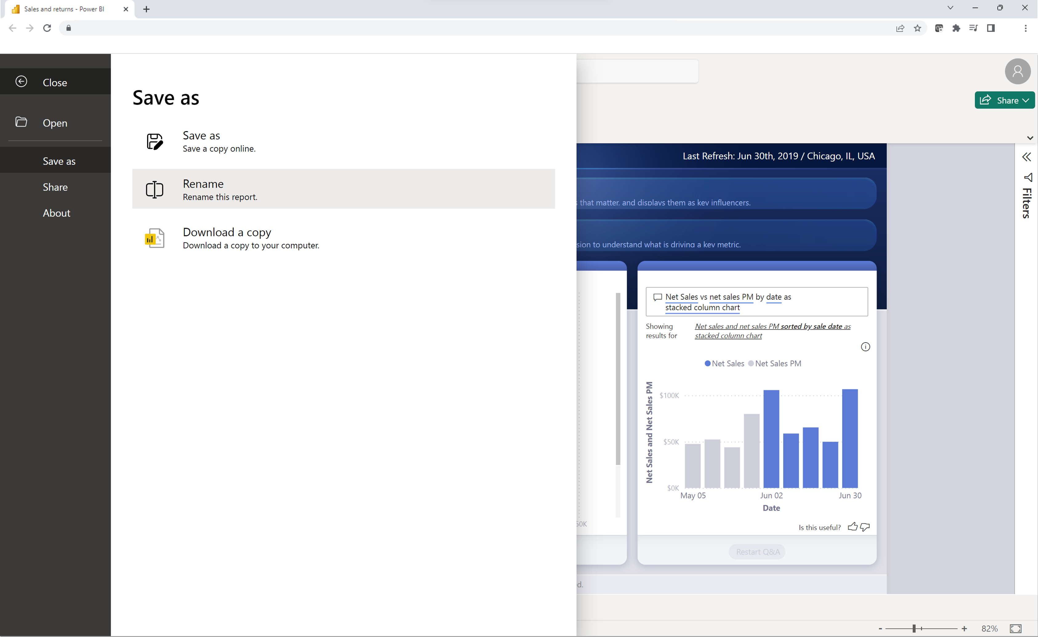 디바이스에 보고서 복사본을 다운로드하려면 파일 메뉴에서 복사본 다운로드를 선택합니다. 파일의 버전이 Power BI 서비스에 복사된 다음, 디바이스에 다운로드됩니다. Power BI Desktop에서 파일을 열어 보고서를 편집하고 Power BI 서비스에 보고서를 다시 게시할 수 있습니다.