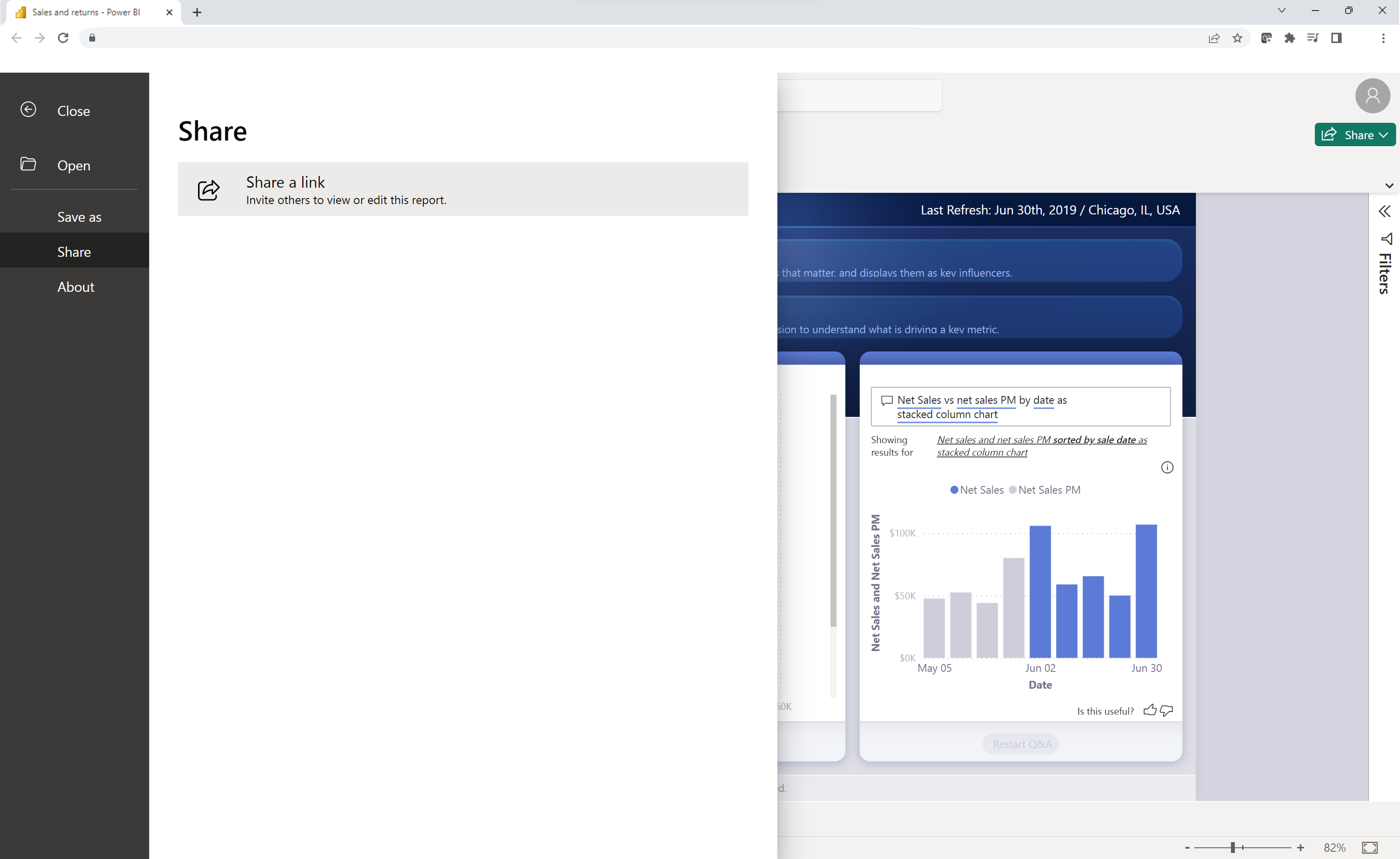 미리 보기는 .pbix 파일을 다운로드하거나, 파일을 공유하거나, 파일에 대한 링크를 복사하는 옵션이 포함된 제한된 환경을 제공합니다.