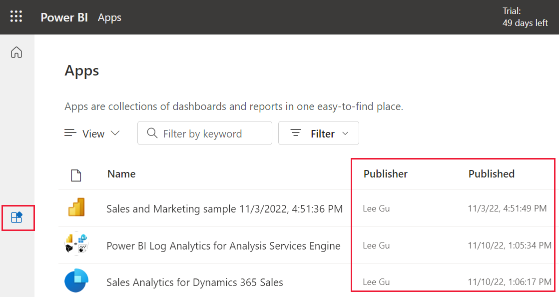 Power BI 서비스의 콘텐츠 목록에는 소유자 열과 타임스탬프 열이 있습니다. 소유자 및 타임스탬프의 형식은 콘텐츠에 따라 달라집니다. 다음 예제는 앱 페이지의 게시자 이름 및 게시 날짜를 보여줍니다.