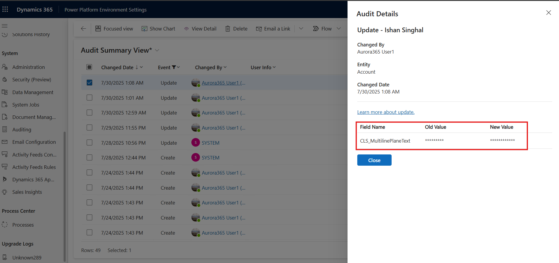 감사 로그는 전후 업데이트 이벤트에서 마스킹된 값을 표시합니다. 권한이 있는 사용자에게만 감사 로그 읽기 권한을 부여합니다.