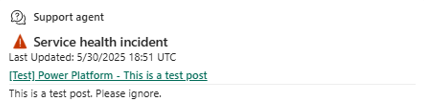 서비스 상태 경고는 제품 또는 테넌트에 영향을 주는 중단을 알립니다. 경고의 제목과 미리 보기가 카드에 표시됩니다. 링크를 선택하여 세부 정보를 볼 수 있습니다. 활성 및 최근에 해결된 경고는 Power Platform 관리 센터의 지원 서비스 상태 페이지와 Microsoft 관리 센터에서 볼 수 있습니다. 서비스 상태 보기에 대해 자세히 알아보세요.