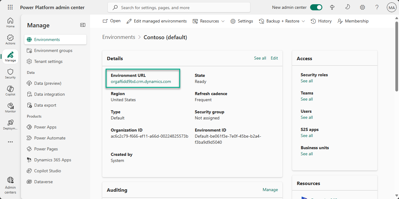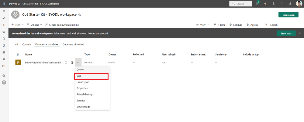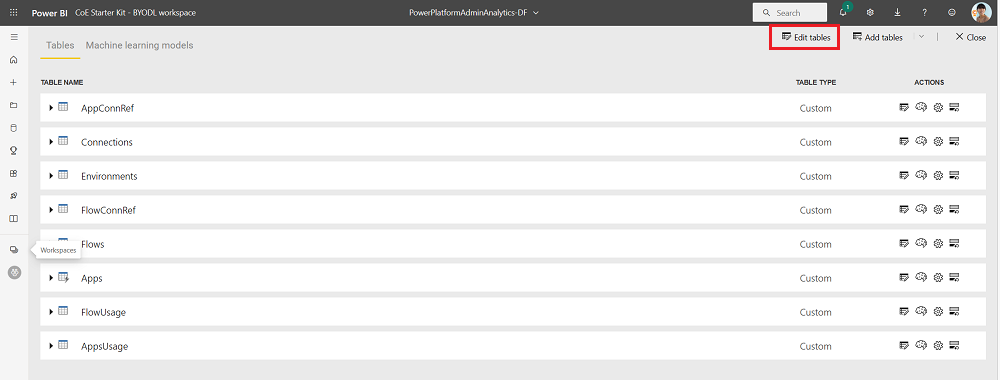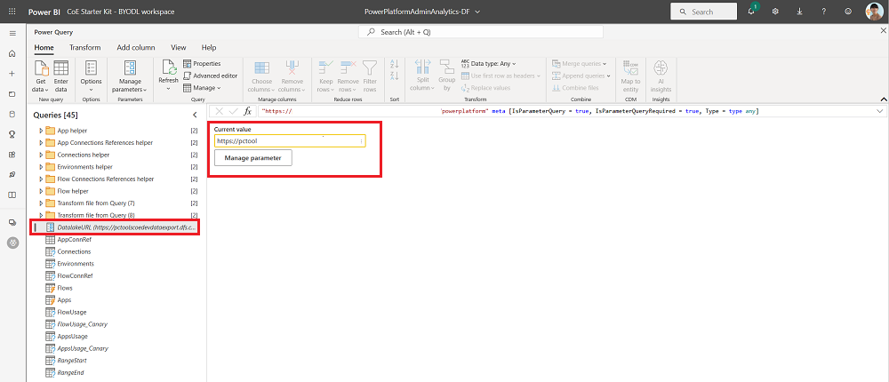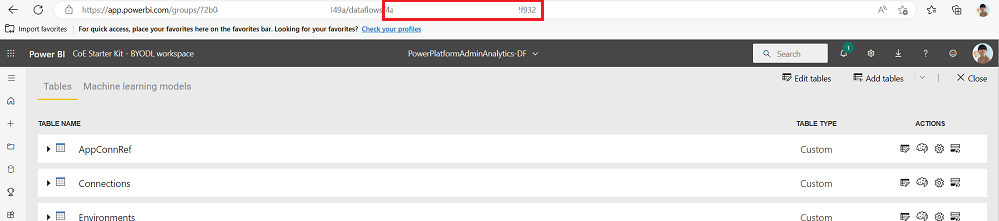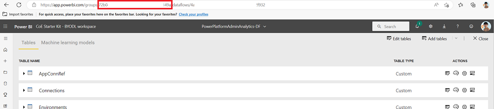 CoE 스타터 키트가 설치된 Power Platform 환경의 URL이 필요합니다. Power BI 해당 환경의 Dataverse 테이블에 연결합니다.