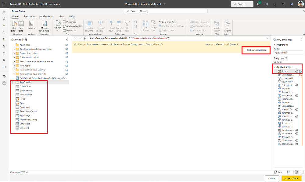 /powerplatform으로 끝나는지 확인하세요(맨 끝에 슬래시/가 없어야 합니다).쿼리 보기에서 각 테이블을 선택하여 연결을 구성하고 계정으로 로그인합니다. 연결 생성에 실패하면 적용된 단계에서 소스를 선택하여 연결 구성을 다시 시도해 보세요.