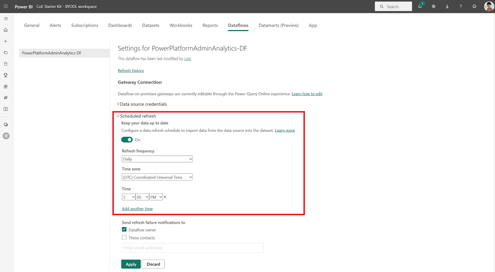 일일 일정 새로 고침을 구성합니다. 데이터 흐름을 새로 고치기 좋은 시기는 데이터 내보내기 기능을 사용하여 저장소 계정에 파일을 쓴 직후입니다. 따라서 데이터가 스토리지 계정으로 내보내진 후에 데이터 흐름이 실행됩니다.