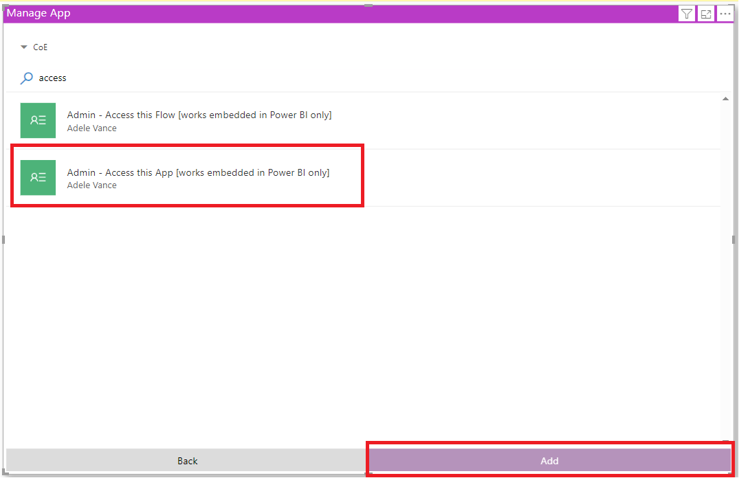 흐름 액세스 관리 탭으로 이동하여 이전 단계를 반복하지만 이번에는 관리자 - 이 흐름에 액세스[Power BI에만 포함된 작업] 앱을 선택합니다.