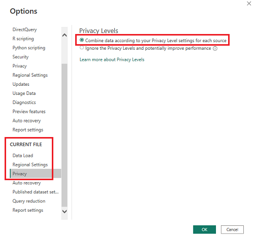 현재 파일>개인 정보를 선택하고 개인 정보 수준을 각 소스에 대한 개인 정보 수준 설정에 따라 데이터 결합으로 설정합니다.