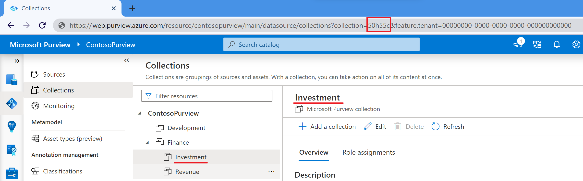 Microsoft Purview 거버넌스 포털의 URL입니다. 컬렉션을 선택하고 url을 검사 collection=라고 하는 위치를 찾습니다. ID입니다. 다음 예제에서 Investment 컬렉션의 ID는 50h55c입니다.