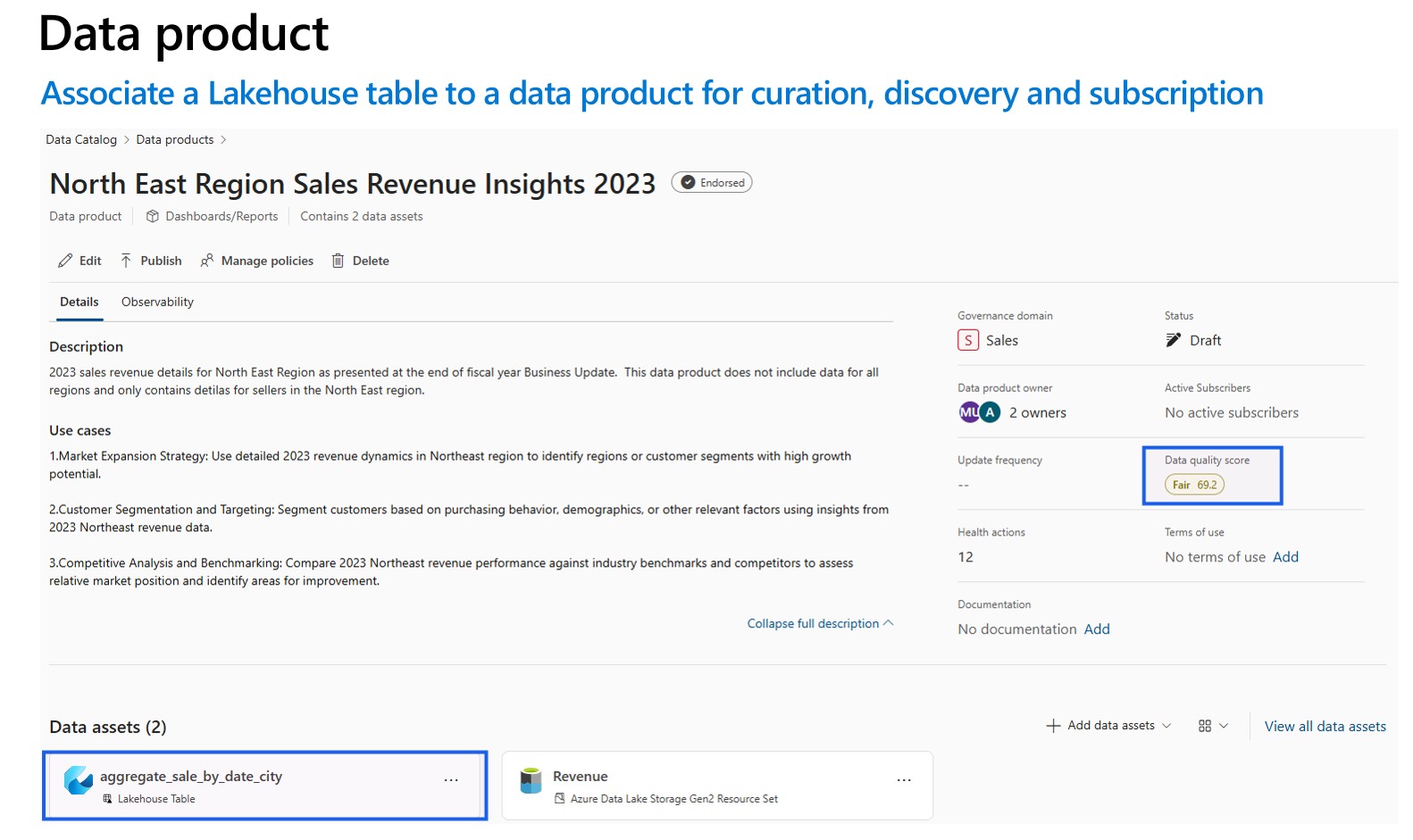 - 큐레이션, 검색 및 구독을 위해 Lakehouse 테이블을 데이터 제품에 연결합니다. 데이터 제품을 만들고 관리하는 방법을 알아봅니다.