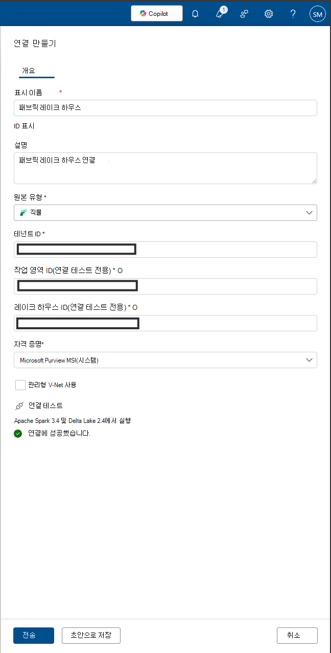 패브릭 테넌트가 Virtual Network 또는 Private Link 실행되도록 구성된 경우 연결 화면에서 vNet 확인란을 검사 합니다. vNet 확인란을 선택하면 패브릭 및 purview가 실행되는 Azure 지역(예: UAE 북부, 서유럽, 캐나다 중부 등)을 선택해야 합니다.