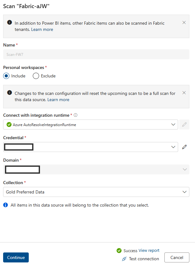 패브릭 레이크하우스를 원본으로 등록한 후 데이터 맵의 등록된 데이터 원본 목록에서 패브릭을 선택하고 새 검사를 선택할 수 있습니다. 데이터 원본 ID를 추가한 다음, 아래 단계를 수행합니다.