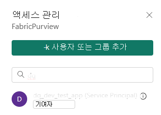 - 데이터 품질 검색의 경우 Microsoft Purview MSI는 패브릭 작업 영역에 대한 기여자 액세스 권한이 있어야 패브릭 작업 영역을 연결할 수 있습니다. 기여자 액세스 권한을 부여하려면 패브릭 작업 영역을 열고 점 3개(...)를 선택하고 작업 영역 액세스를 선택한 다음 사용자 또는 그룹 추가를 선택한 다음 Purview MSI를 기여자로 추가합니다.