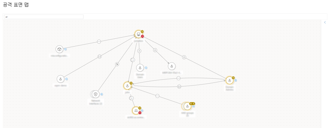 또 다른 예에서는 공격 표면 맵에서 위협에 대한 노출을 찾고 초크 지점을 식별할 때 자산 아이콘을 둘러싼 후광 색과 크라운 표시기를 시각적으로 높은 위험 수준을 나타냅니다.