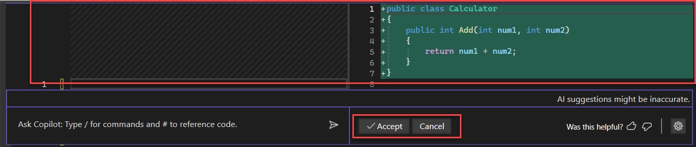 Visual Studio diff 보기에 코필로트 채팅의 코드 제안이 표시됩니다. 제안된 내용을 검토하고 구체화한 후, 수락 을 선택하여 코드에 적용하거나 취소 를 선택하여 취소할 수 있습니다.