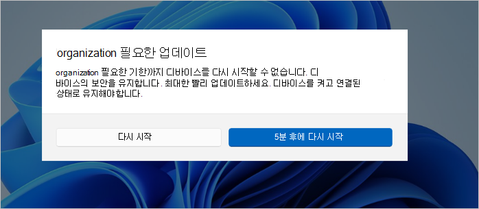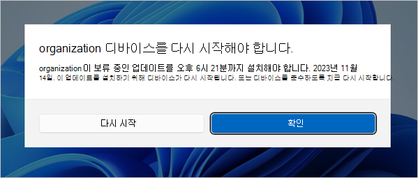 사용자가 다시 시작을 끄기(기본값)로 업데이트해야 할 때 알림(기본값)을 설정하면 디바이스가 업데이트에 대한 다시 시작 보류 상태가 된 후 24시간 후에 다시 시작해야 한다는 알림 메시지가 표시됩니다.