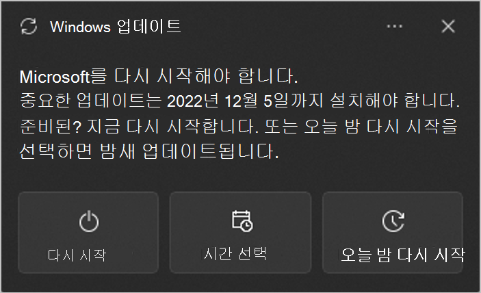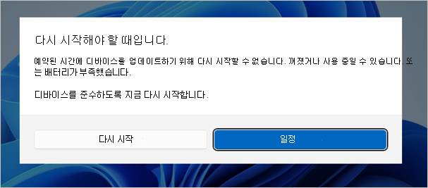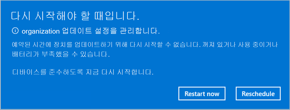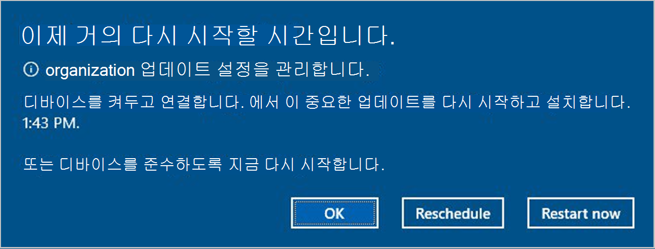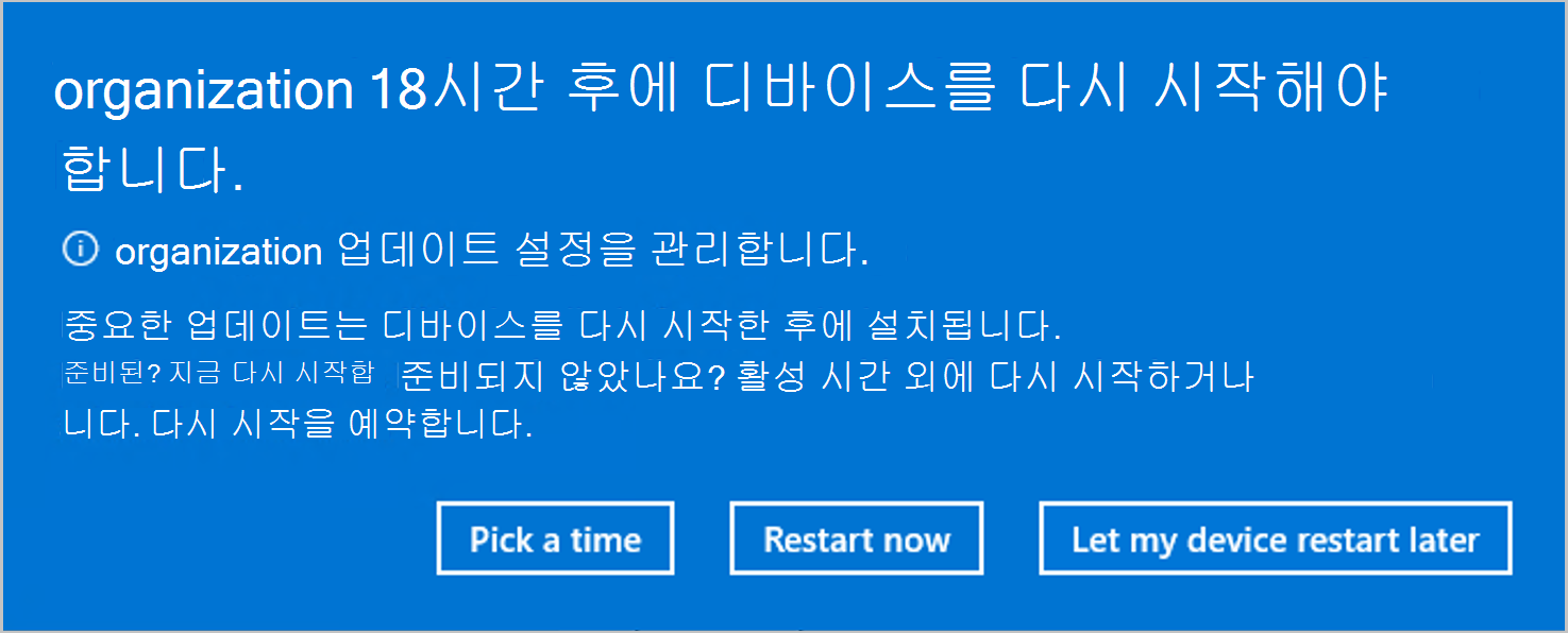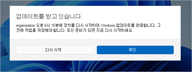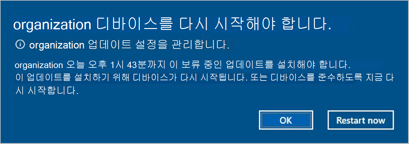 사용자와 관리자가 구성하는 설정에 따라 사용자에게 업데이트를 알리는 마감일 전에 알림 메시지가 가끔 발생할 수 있습니다. 이 시간 동안 허용되는 경우 활성 시간 후에 자동 다시 시작이 예약될 수 있습니다.