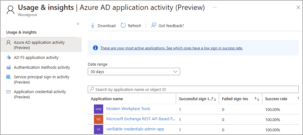 Para exibir dados de entrada específicos do aplicativo, navegue até Insights de uso de integridade do Monitoramento & de ID>>do Microsoft Entra.& Esses relatórios fornecem uma visão mais detalhada das entradas para a atividade do aplicativo Microsoft Entra e a atividade do aplicativo AD FS. Para obter mais informações, consulte Insights de uso & do Microsoft Entra.