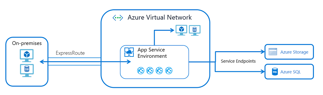 Com um ASE, você não precisa usar a integração de rede virtual, pois o ASE já está na rede virtual. Se você quiser acessar recursos, como o SQL ou o Armazenamento do Microsoft Azure em pontos de extremidade de serviço, habilite os pontos de extremidade de serviço na sub-rede do ASE. Se quiser acessar recursos na rede virtual ou em pontos de extremidade privados da rede virtual, não é necessário fazer nenhuma configuração extra. Se quiser acessar recursos no ExpressRoute, você já está na rede virtual e, portanto, não precisa configurar nada no ASE ou nos aplicativos incluídos nele.