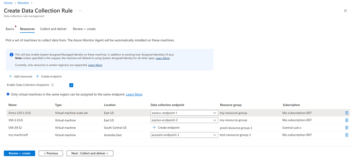 Associe os DCEs aos recursos de destino editando o DCR no portal do Azure. Na guia Recursos, selecione Habilitar Pontos de Extremidade de Coleta de Dados. Selecione um DCE para cada máquina virtual. Confira Configurar a coleta de dados para o agente do Azure Monitor para saber mais.