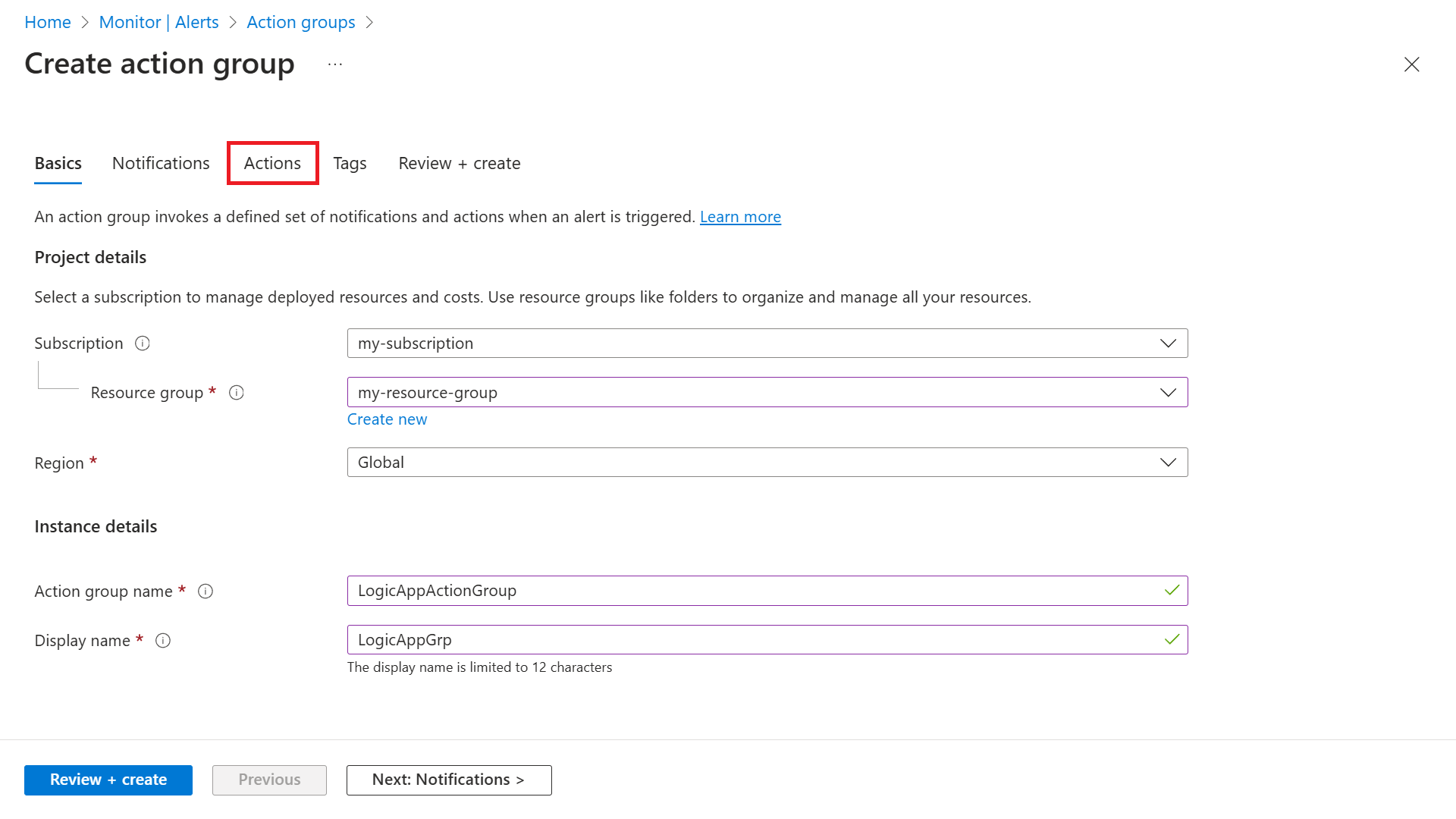 Insira um nome para o Nome do grupo de ações e Nome de exibição.