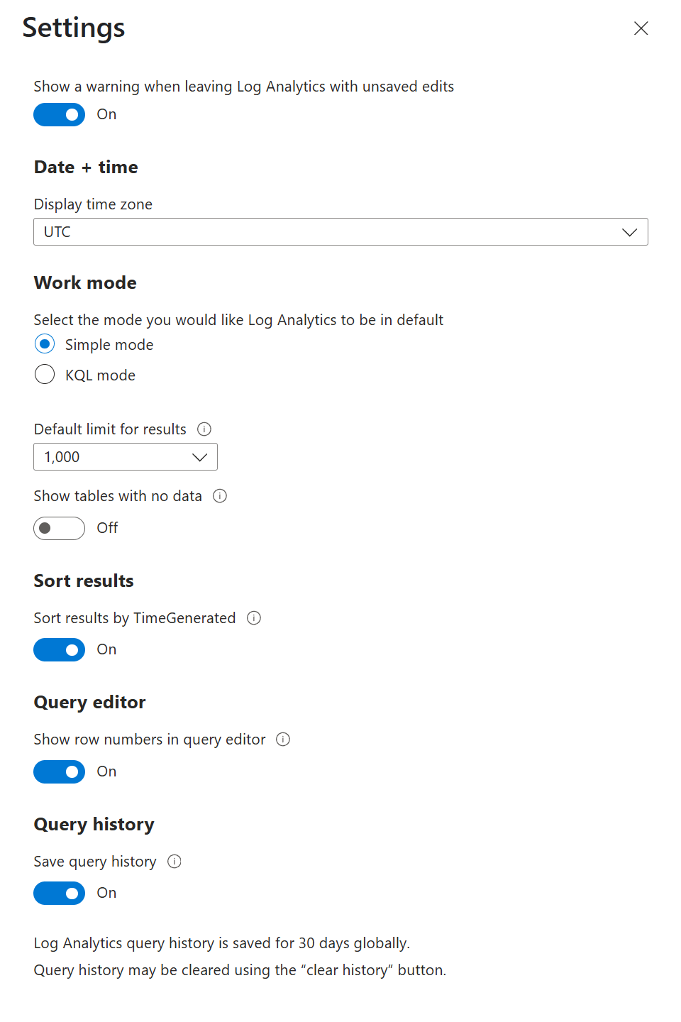 Configurações do Log Analytics | Defina as configurações padrão do Log Analytics, incluindo fuso horário, se o Log Analytics é aberto no modo Simples ou KQL e se deseja exibir tabelas sem dados. Veja a captura de tela abaixo. |