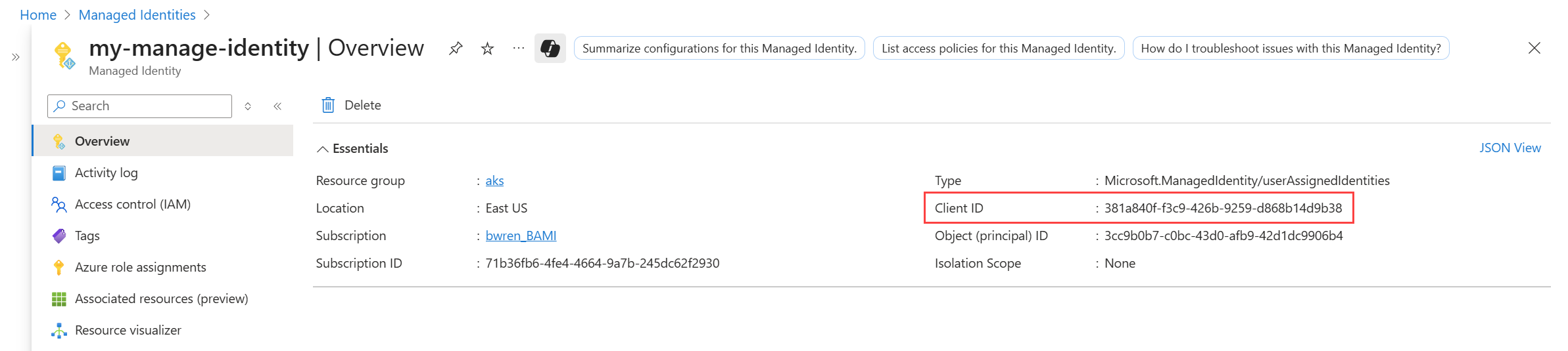Para um cluster AKS, a identidade gerenciada deve ser atribuída aos conjuntos de escalas de máquinas virtuais do cluster. O AKS cria um grupo de recursos que contém os conjuntos de dimensionamento de máquinas virtuais. Acesse esse grupo de recursos na página Propriedades no menu do cluster no portal Azure. Clique em Grupo de Recursos de Infraestrutura para exibir a lista de recursos neste grupo de recursos. Você deve habilitar a identidade gerenciada pelo sistema para cada conjunto de dimensionamento de máquinas virtuais no grupo de recursos.