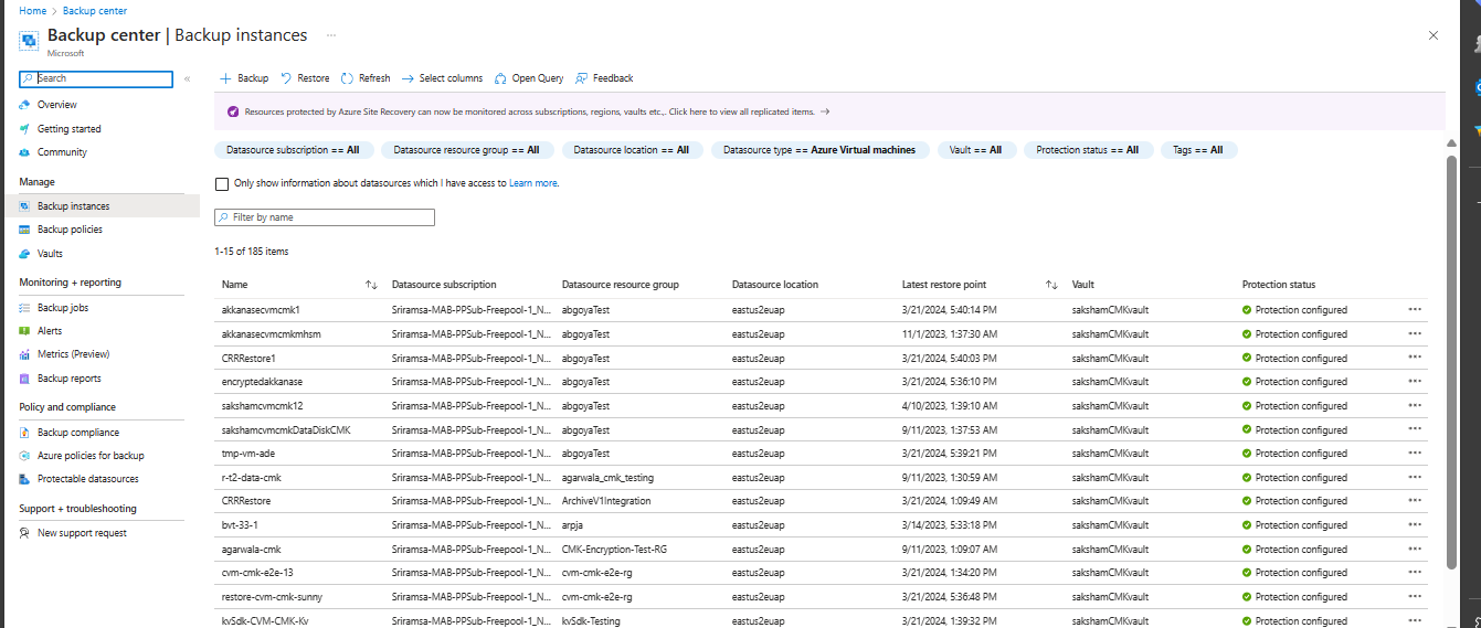 A folha Itens Protegidos mostra todas as instâncias de backup criadas entre as assinaturas. Use os filtros para acessar a instância de backup que você gostaria de dar uma olhada. Selecione no item protegido e abra-o.
