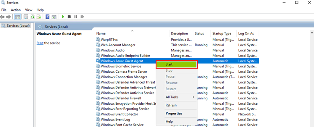 REG ADD "HKLM\SOFTWARE\Microsoft\BcdrAgent" /v IsProviderInstalled /t REG_SZ /d False /fREG ADD "HKLM\SOFTWARE\Microsoft\BcdrAgentPersistentKeys" /v IsCommonProviderInstalled /t REG_SZ /d False /fNa janela Serviços , inicie o Agente Convidado do Windows Azure.