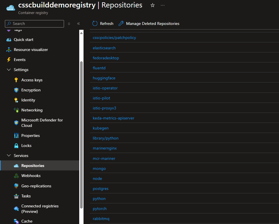 - Depois que o fluxo de trabalho for bem-sucedido, vá para o portal do Azure para exibir suas tarefas em execução. Selecione Serviços –> Repositórios e você deverá ver um novo repositório chamado