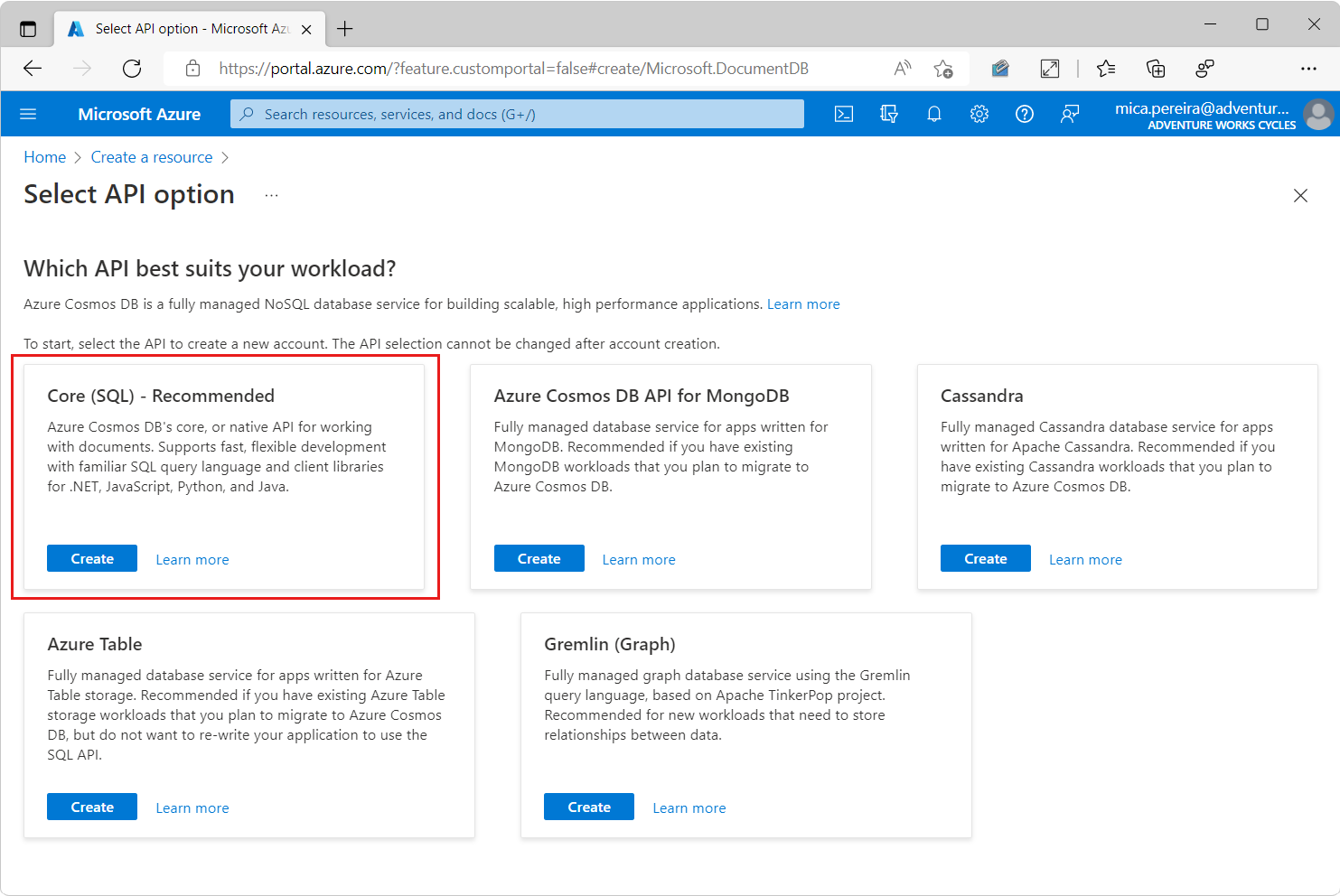 Na página Selecionar uma opção de API, clique na opção Criar da seção NoSQL – Recomendado. O Azure Cosmos DB tem cinco APIs: SQL, MongoDB, Gremlin, Table e Cassandra. Saiba mais sobre a API para NoSQL.