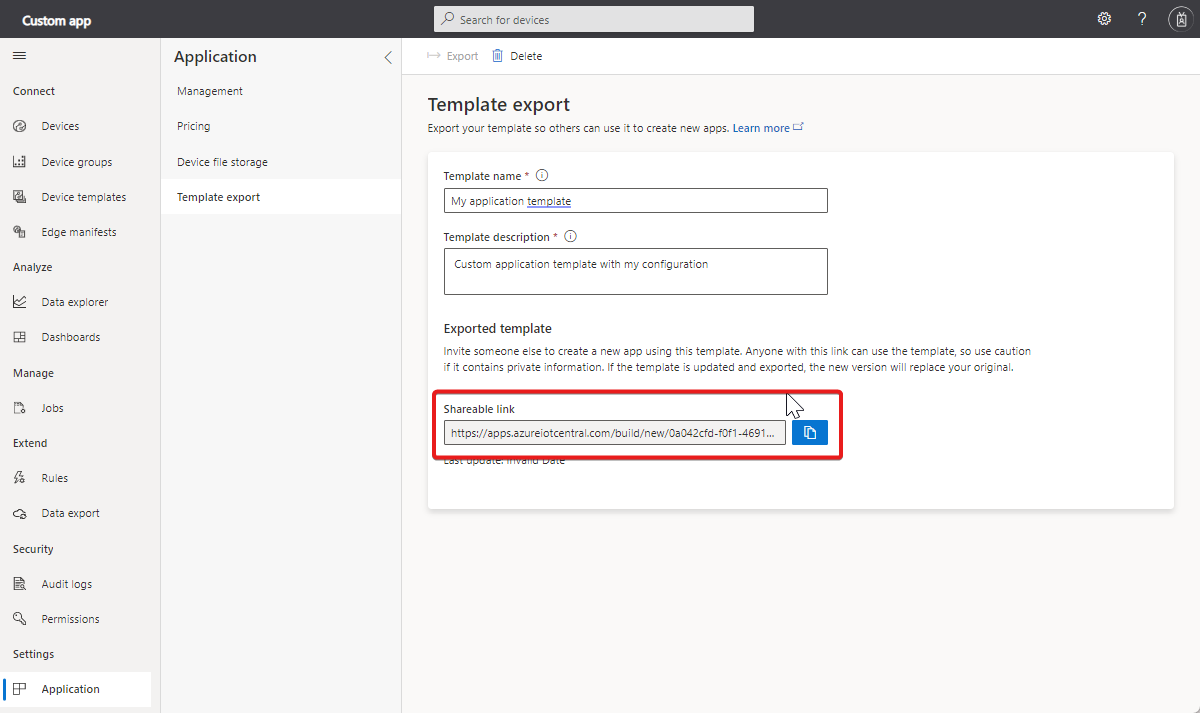 - Selecione o botão Exportar para criar o modelo de aplicativo. Agora você pode copiar o Link compartilhável que permite que alguém crie um novo aplicativo a partir do modelo: