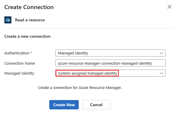 Se o seu cenário exigir um controle mais fino sobre a autenticação de conexões de API, você poderá, opcionalmente, alterar a autenticação da conexão nº 1 da identidade atribuída pelo sistema padrão para qualquer identidade atribuída pelo usuário que você tenha adicionado ao aplicativo lógico. Essa autenticação se aplica a cada conexão de API, para que você possa combinar identidades atribuídas pelo sistema e atribuídas pelo usuário entre diferentes conexões com o mesmo recurso de destino.