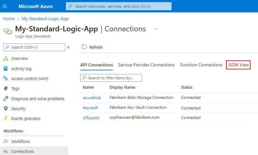 No painel Conexões, selecione Exibição JSON.