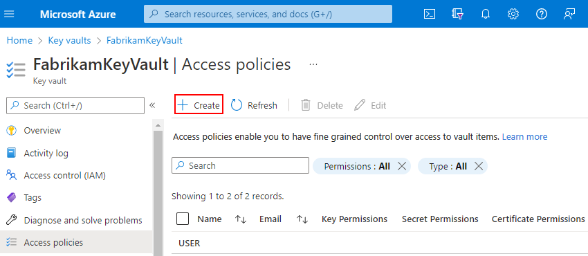 Na barra de ferramentas da página Identidades gerenciadas, selecione Criar.