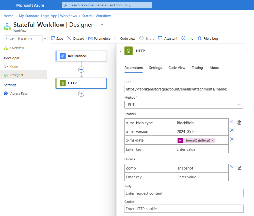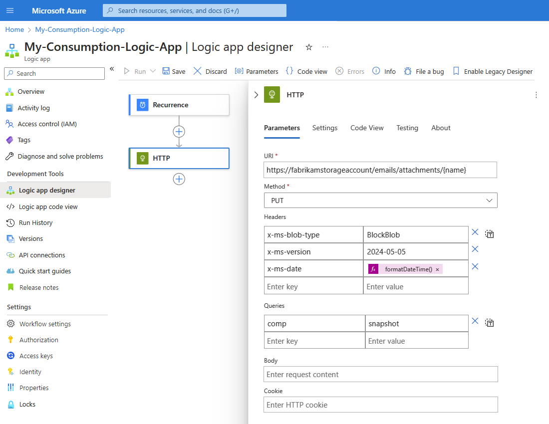 Abra o recurso de aplicativo lógico no portal do Azure.