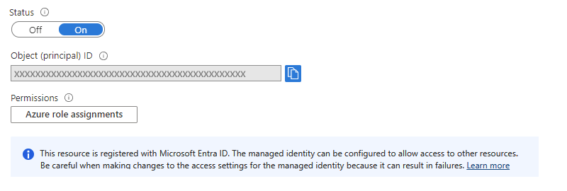 Propriedade Valor Descrição ID do objeto (principal) < identity-resource-ID> Um GUID (Identificador global exclusivo) que representa a identidade atribuída pelo sistema para seu aplicativo lógico em um locatário do Microsoft Entra. Agora, siga as etapas que dão acesso à identidade atribuída pelo sistema ao recurso mais adiante neste guia.