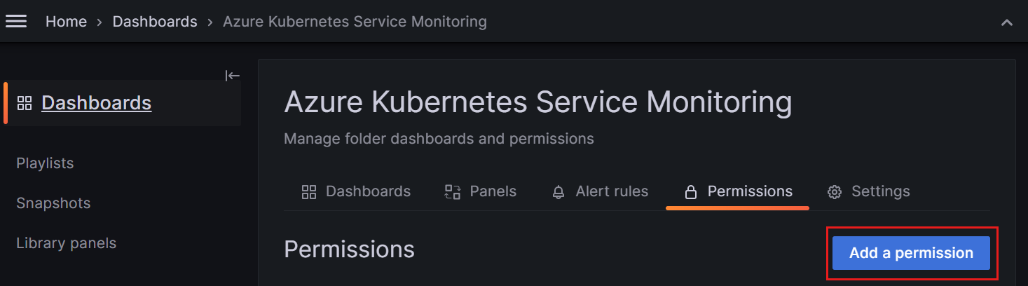 No Espaço Gerenciado do Azure para Grafana, você pode usar as funções RBAC (controle de acesso baseado em função) do Azure para o Grafana para definir os direitos de acesso. Essas permissões se aplicam, por padrão, a todos os recursos no seu workspace do Grafana, não por pasta ou painel. Se você atribuir um usuário à função Editor do Grafana, esse usuário poderá editar qualquer painel em seu workspace do Grafana. Porém, com o modelo de permissão granular do Grafana, você pode ajustar o nível de permissão padrão de um usuário para painéis específicos ou pastas do painel.