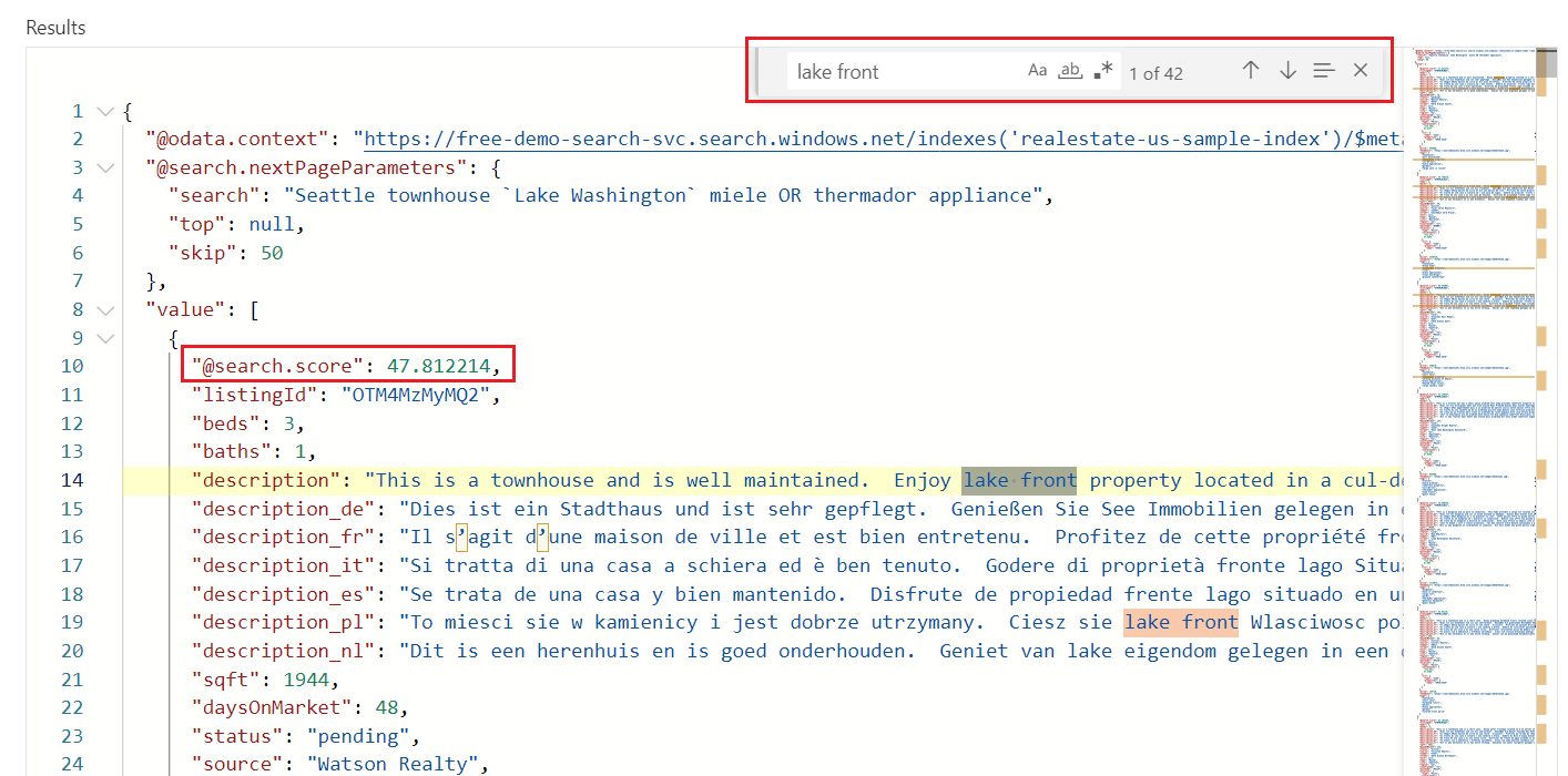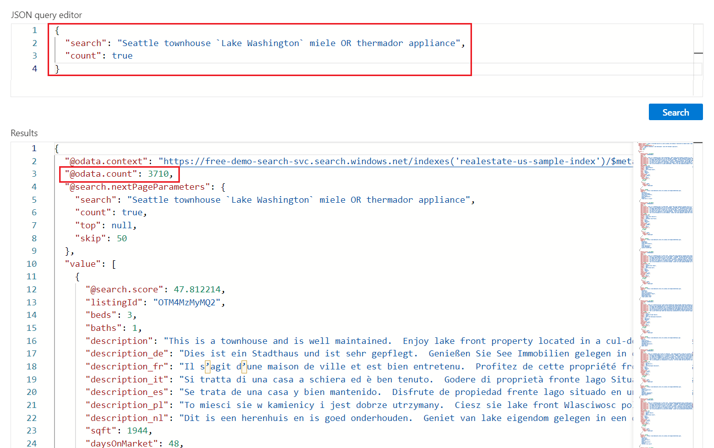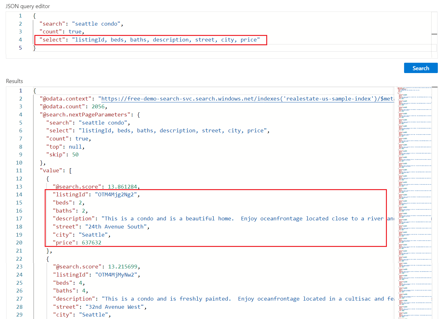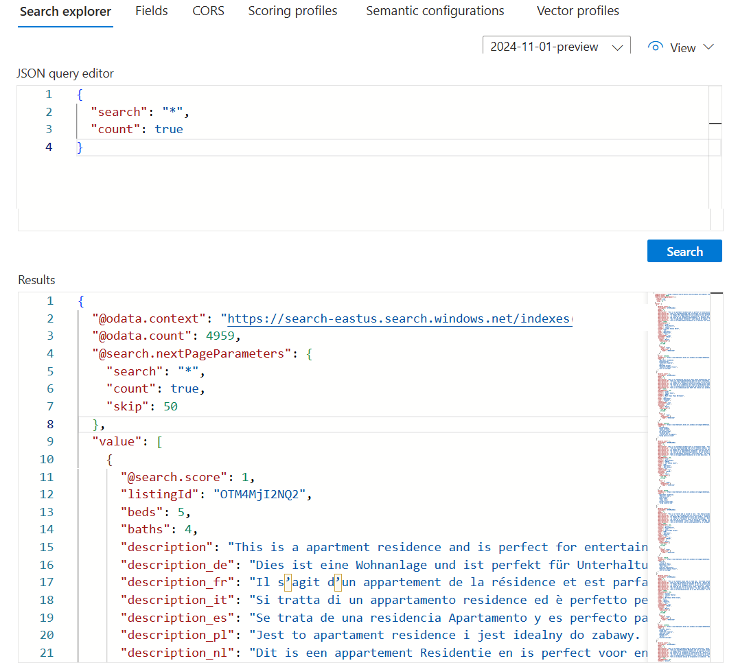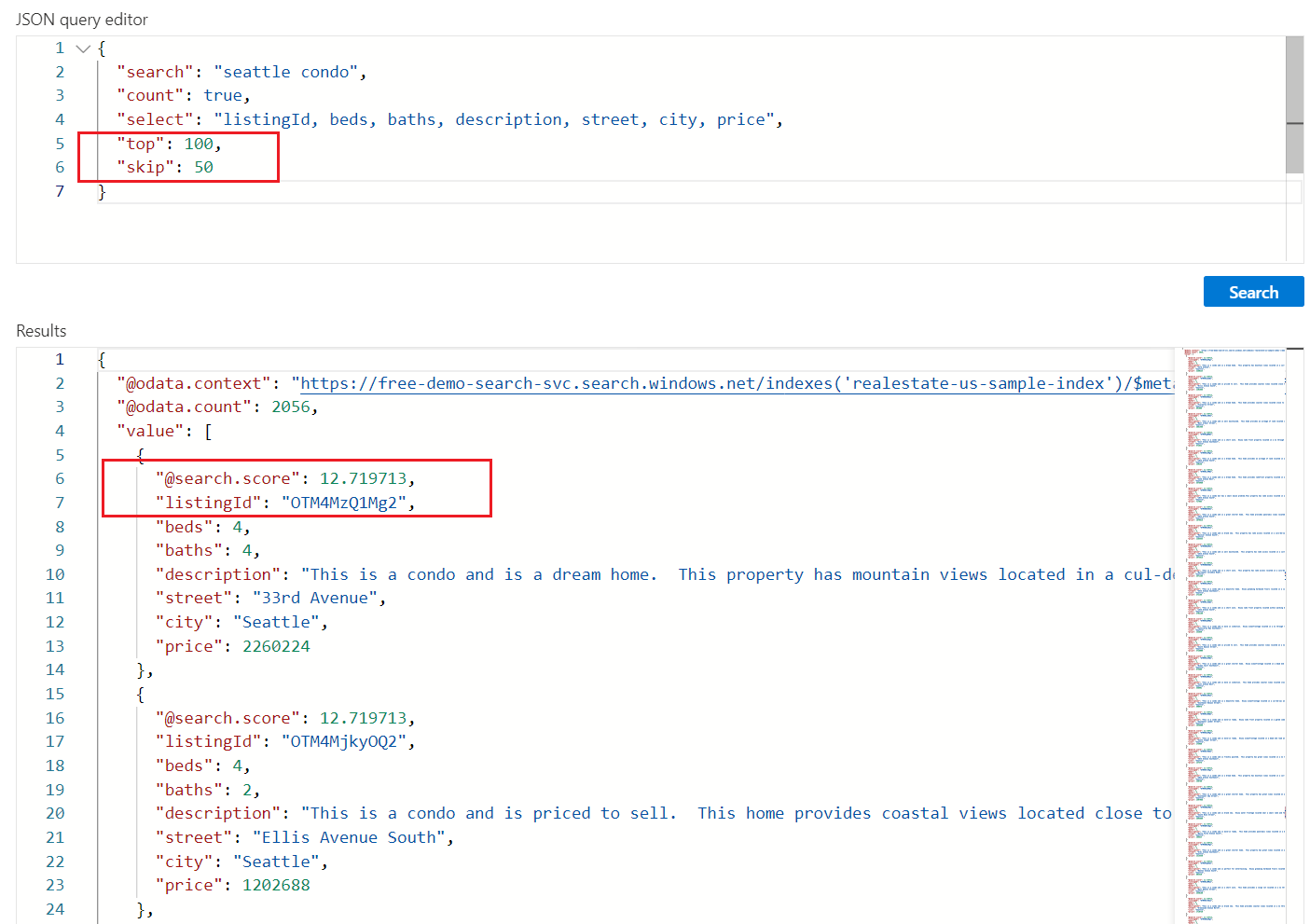O Azure AI Search retorna as 50 principais correspondências com base na classificação de pesquisa. Para obter o próximo conjunto de documentos correspondentes, acrescente "top": 100 e "skip": 50 para aumentar o conjunto de resultados para 100 documentos (o padrão é 50, o máximo é 1000), ignorando os primeiros 50 documentos. Você pode verificar a chave do documento (listingID) para identificar um documento.