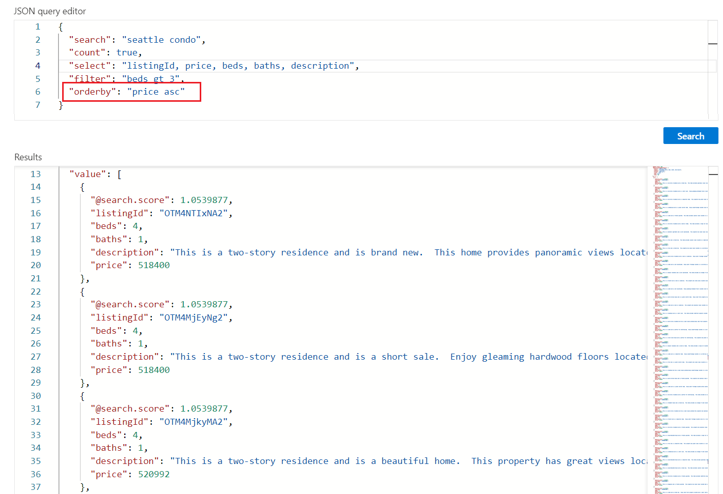 Adicione orderby para classificar os resultados por outro campo além da pontuação de pesquisa. O campo deve ser atribuído como classificável no índice. Em situações em que o valor filtrado é idêntico (por exemplo, o mesmo preço), a ordem é arbitrária, mas você pode adicionar mais critérios para uma classificação mais profunda. Aqui está uma expressão de exemplo que você pode usar para testar isso: