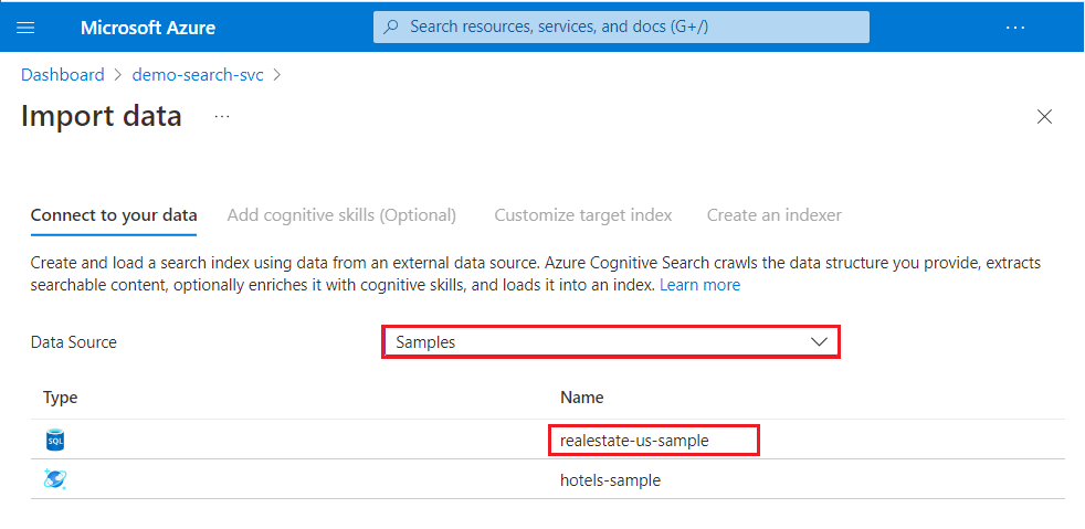 Este início rápido usa o índice realestate-us-sample. Para criar o índice, execute o Assistente de Importação de Dados, selecione os dados de exemplo incorporados e avance no assistente usando todos os valores padrão.