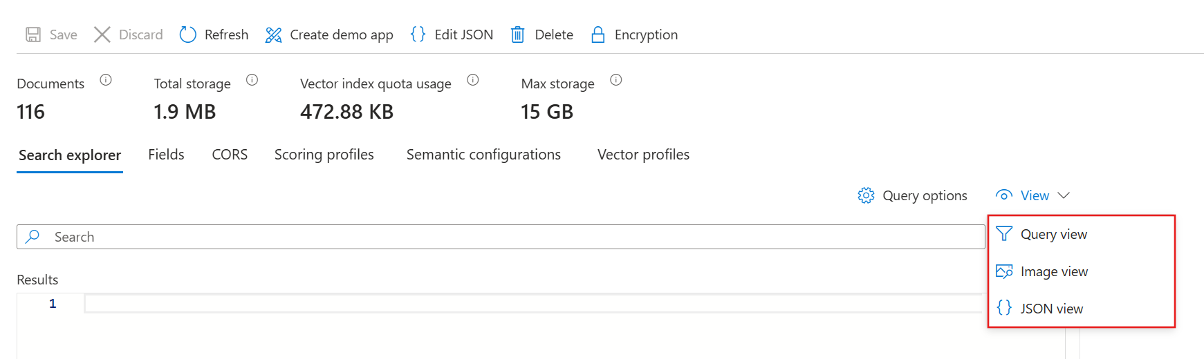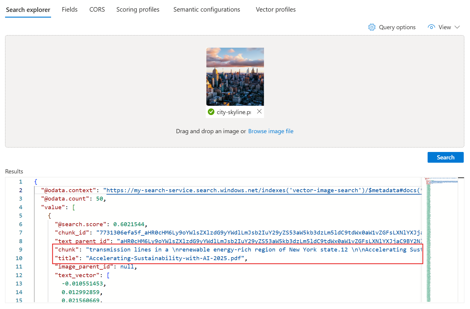 Explorador de Pesquisa aceita imagens como entradas de consulta por meio da Visualização de imagem, o que exige a utilização de um par vetorizador–habilidade compatível. Para obter mais informações, consulte Configurar um vetorizador em um índice de pesquisa.