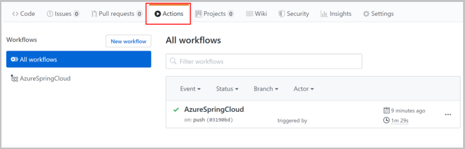 Para verificar se a ação foi habilitada, selecione a guia Ações na página de repositório do GitHub: