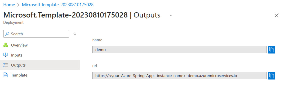 Após a conclusão da implantação, use as seguintes etapas para localizar a URL do aplicativo nas saídas de implantação: