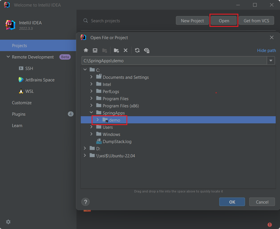 Na caixa de diálogo Abrir Arquivo ou Projeto, selecione a pasta demo.