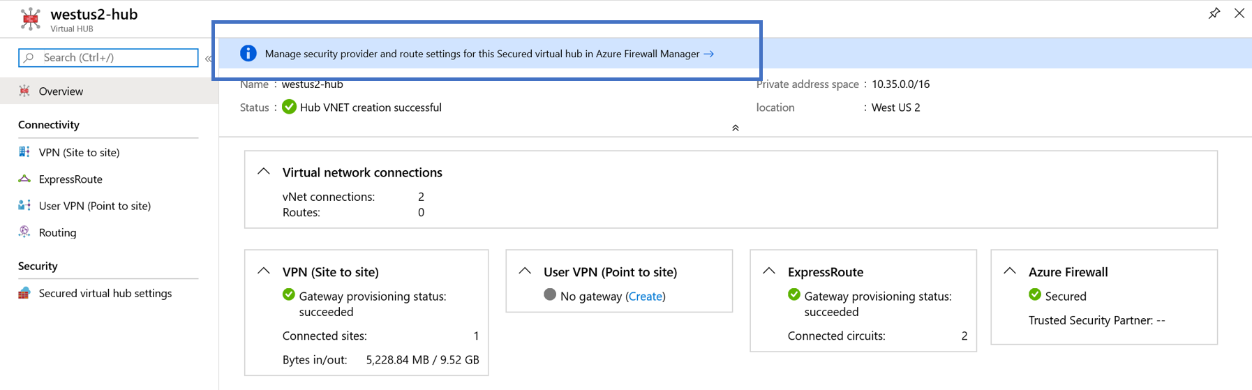 Na página Visão geral da WAN virtual, selecione o hub seguro. Na página do hub, você pode ver todos os recursos do hub virtual, incluindo o Firewall do Azure.