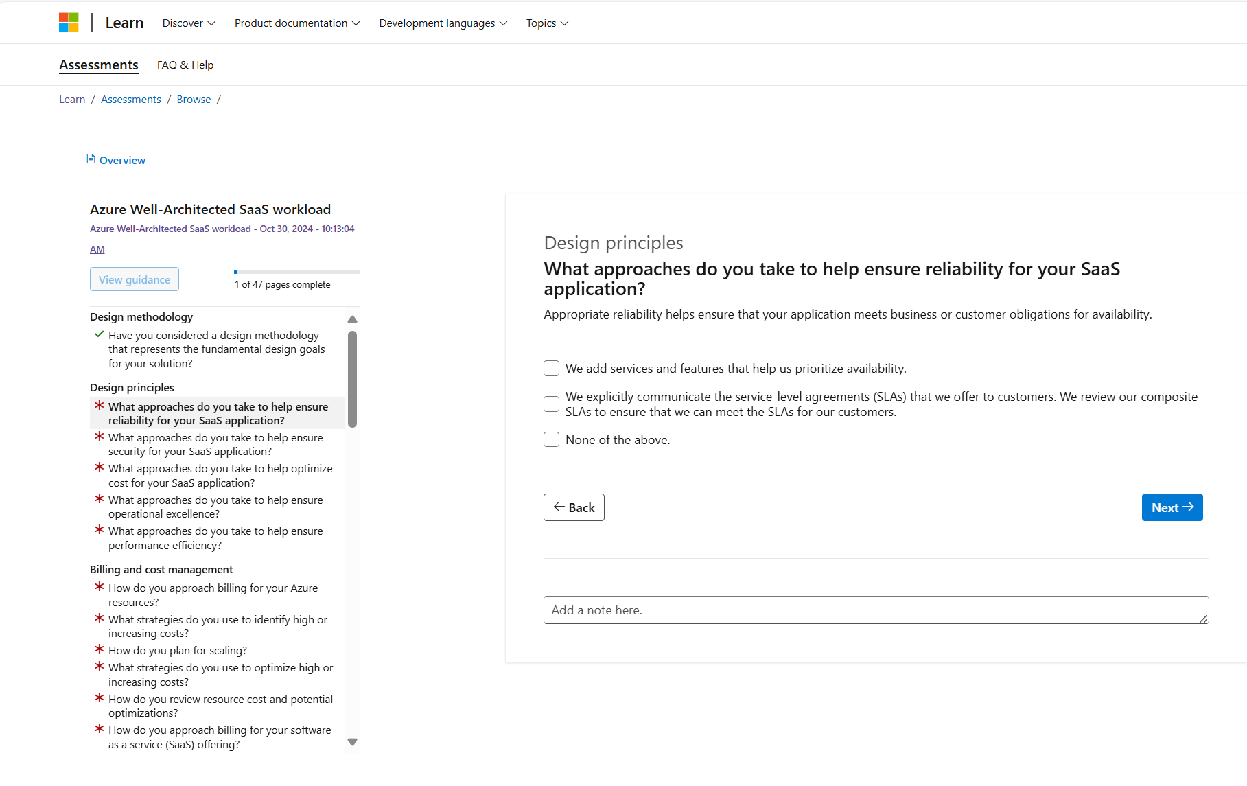 As perguntas na avaliação são baseadas nas áreas de design de carga de trabalho de SaaS. Essas áreas de design ajudam a verificar as opções de design fundamentais da arquitetura da carga de trabalho e da abordagem operacional de ponta a ponta.